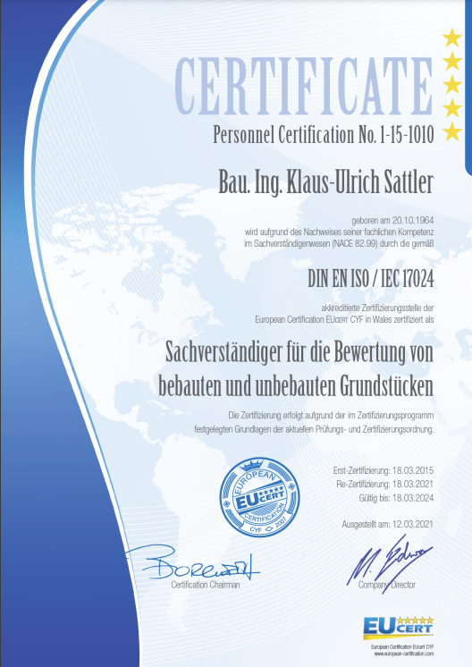 Sachverständiger nach DIN EN ISO/IEC 17024 für die Bewertung von bebauten und unbebauten Grundstücken der EUC Cert seit 2015 (re-zertifiziert bis März 2024)